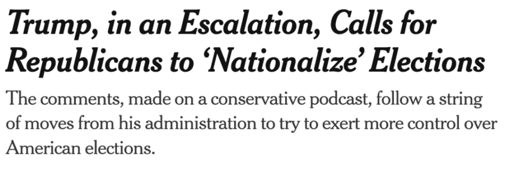 That’s right. The guy who still can’t accept that he lost the 2020 election now wants to take over elections altogether.